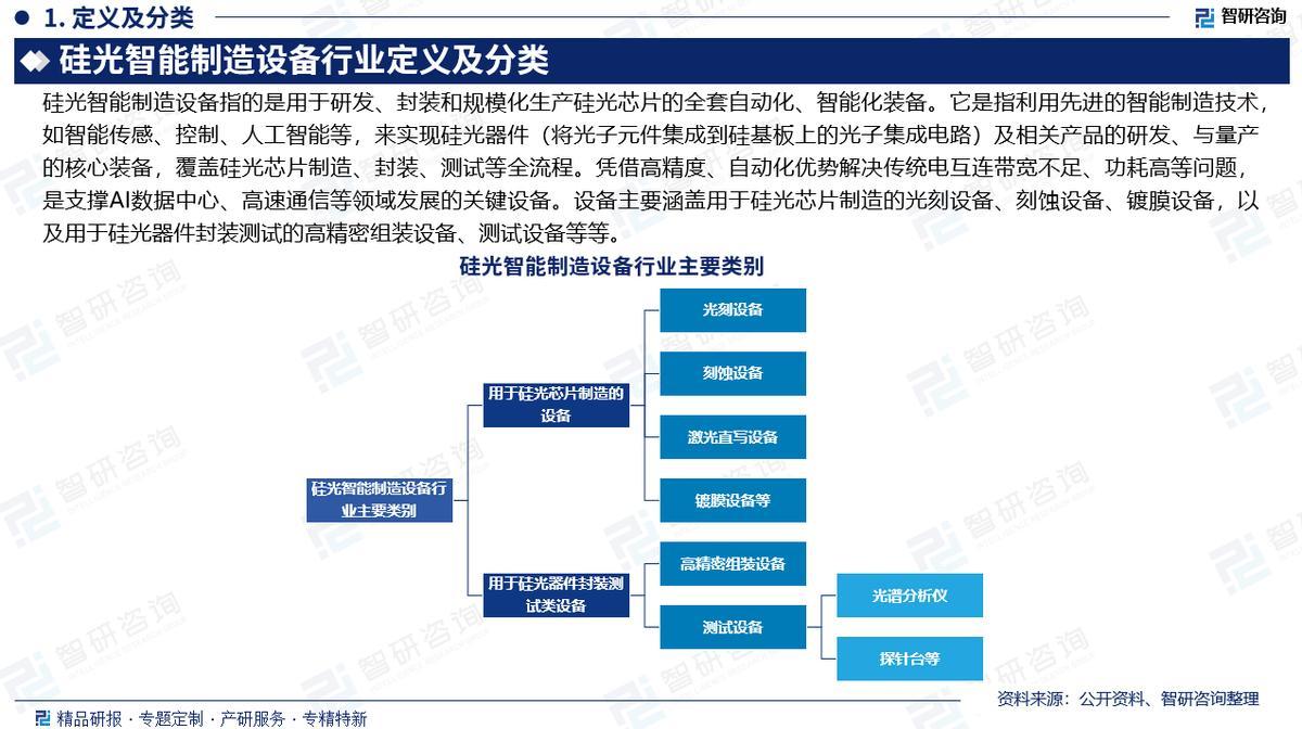 行业界说及分类:硅光智能制造建立指的是用于研发、封装和限制化出产硅光芯片的全套自动化、智能化装备。凭借高精度、自动化上风处治传统电互连带宽不及、功耗高档问题,是支抓AI数据中心、高速通讯等规模发展的环节建立。建立主要涵盖用于硅光芯片制造的光刻建立、刻蚀建立、镀膜建立,以及用于硅光器件封装测试的高精密拼装建立、测试建立等等。