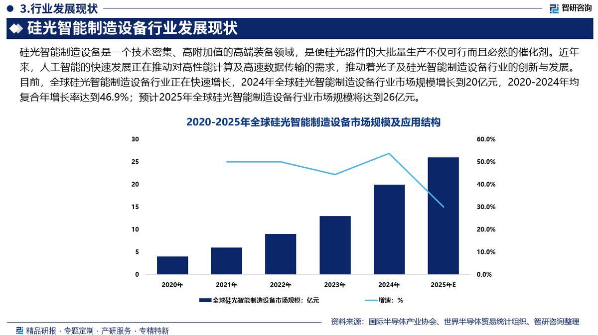 硅光智能制造建立是一个时间密集、高附加值的高端装备规模,是使硅光器件的大量量出产不仅可行而况势必的催化剂。连年来,东说念主工智能的快速发展正在鼓励对高性能狡计及高速数据传输的需求,鼓励着光子及硅光智能制造建立行业的窜改与发展。现在,人人硅光智能制造建立行业正在快速增长,2024年人人硅光智能制造建立行业市集限制增长到20亿元,2020-2024年均复合年增长率达到46.9%;预测2025年人人硅光智能制造建立行业市集限制将达到26亿元。